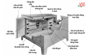 - Hệ thống quạt gió: Thổi không khí nóng và lưu thông đều khắp buồng sấy, đồng thời hút và đẩy hơi ẩm ra ngoài.